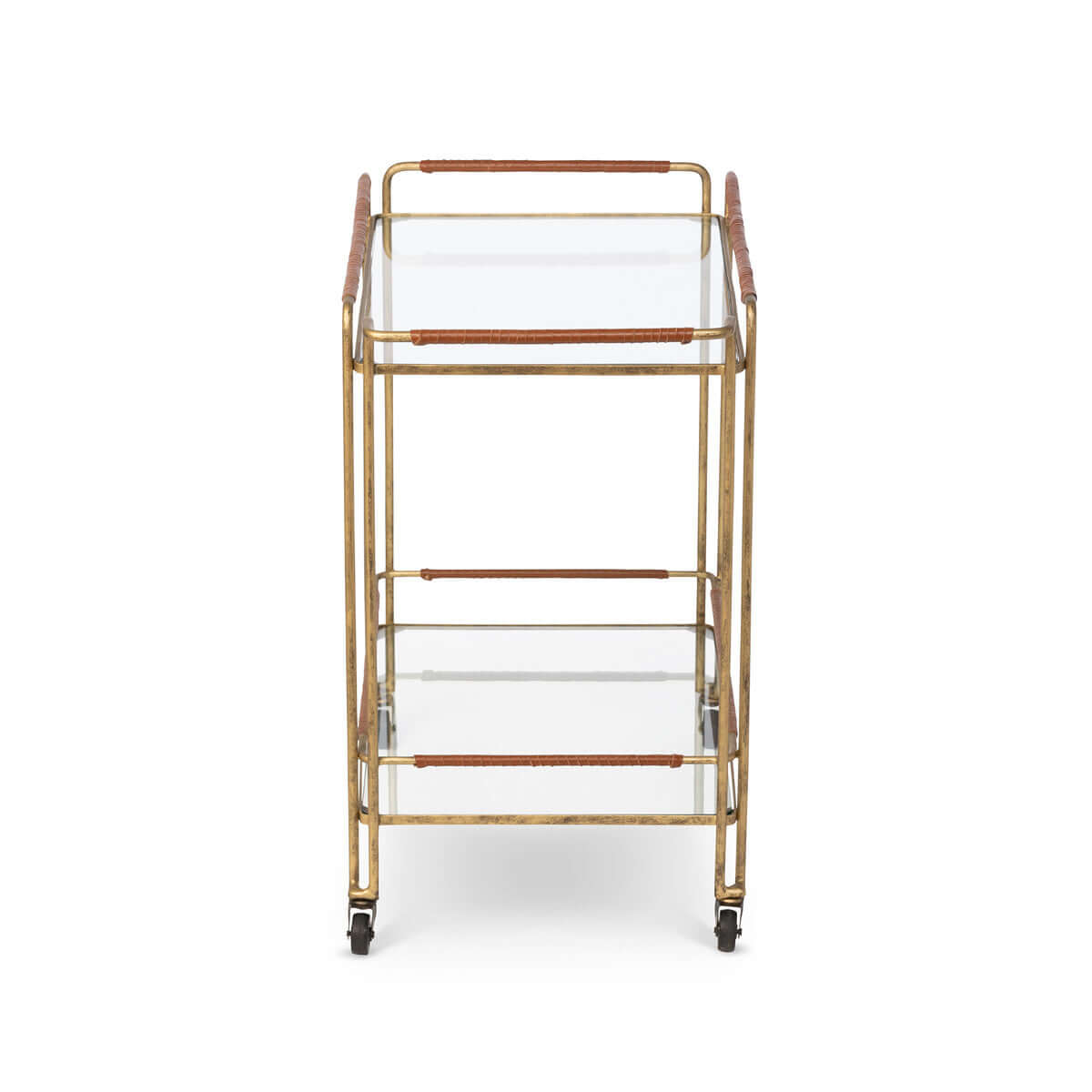 A leather-wrapped iron frame adds handsome detail to this essential bar cart. Keep all of your bar accessories at hand and displayed to complement any room. The fully functioning caster wheels also make it a great serving piece and allow you to easily move it from room to room to follow the party.