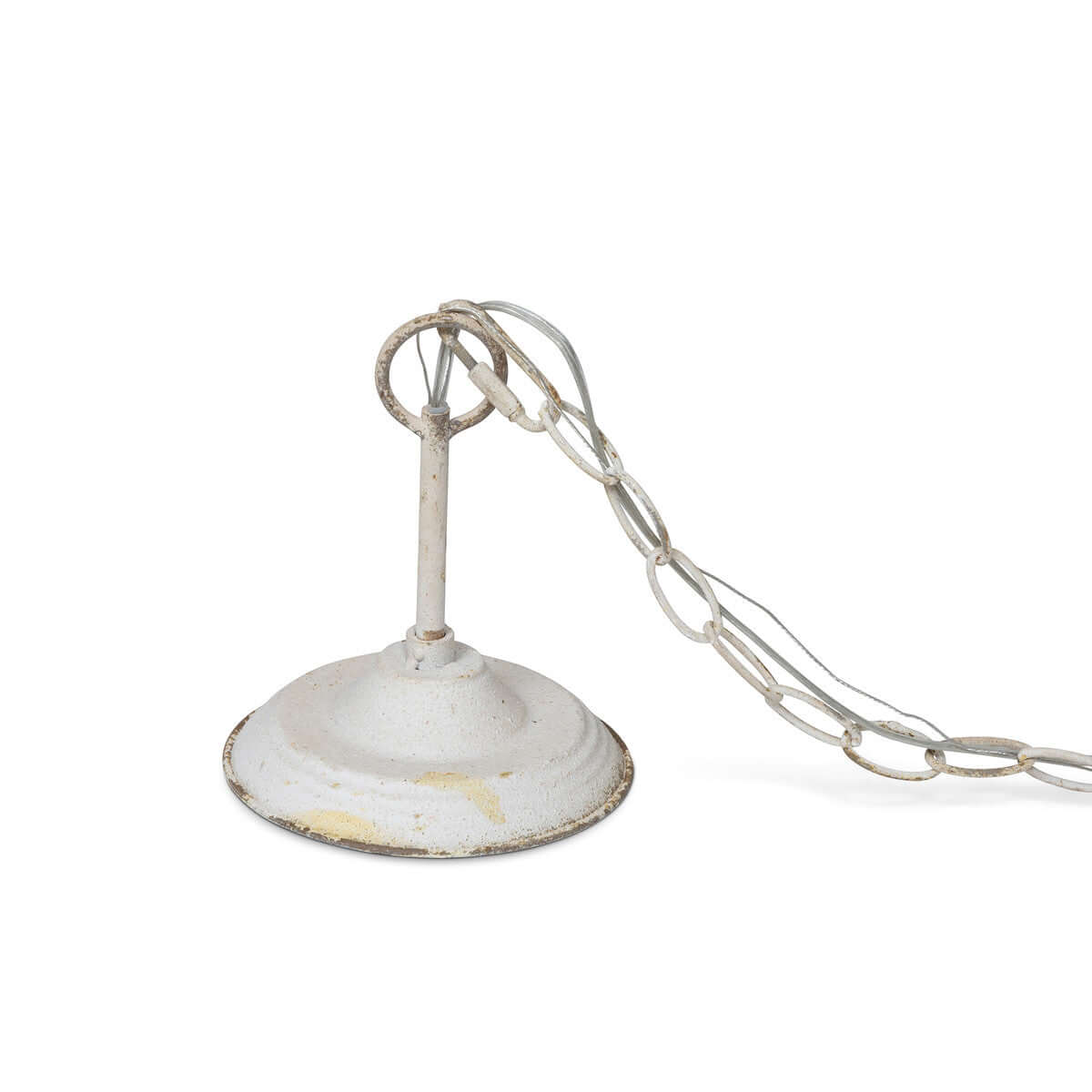 As though salvaged from an old factory, this industrial-style pendant light features a distressed antique white paint finish on metal.